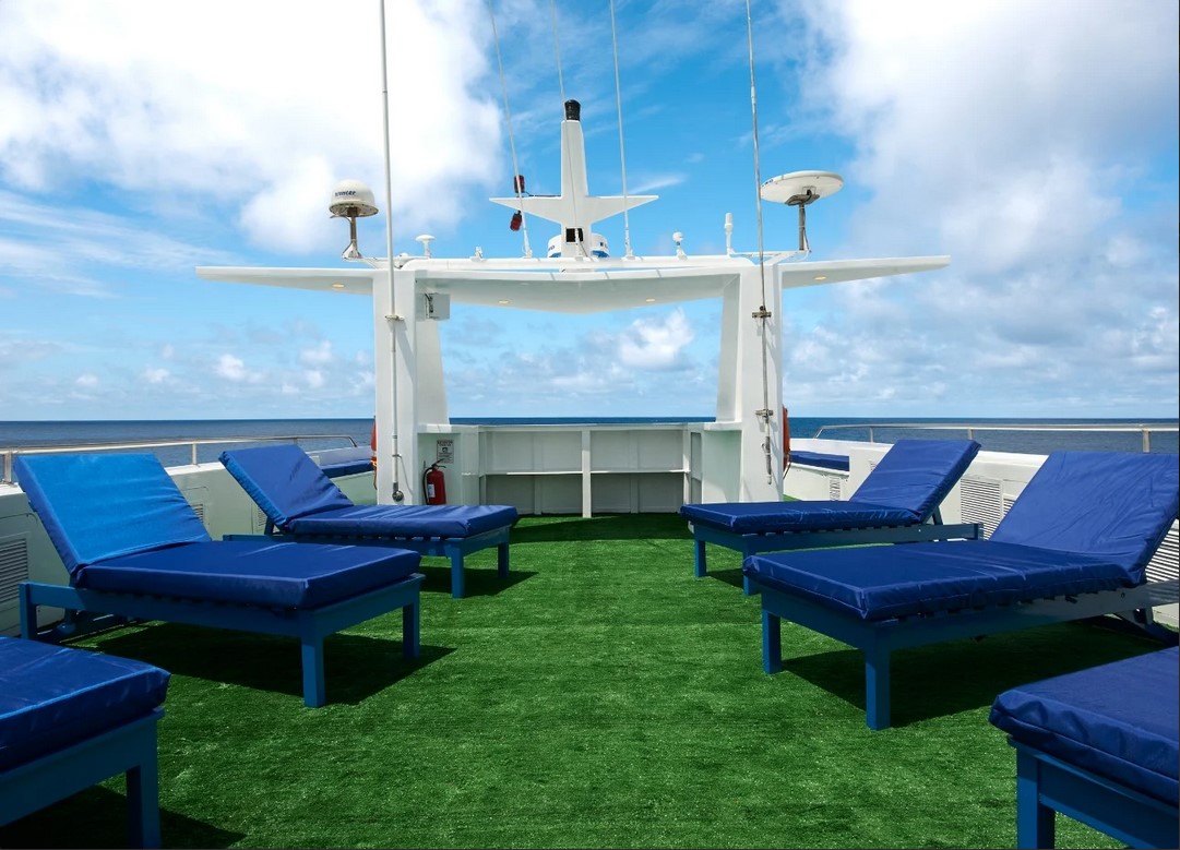 Dla Gości przeznaczone są również dwa pokłady słoneczne, jeden częściowo zacieniony z wygodnymi sofami, drugi znajdujący się na najwyższym pokładzie, w pełni nasłoneczniony dla sympatyków wspaniałych widoków i pięknej opalenizny.