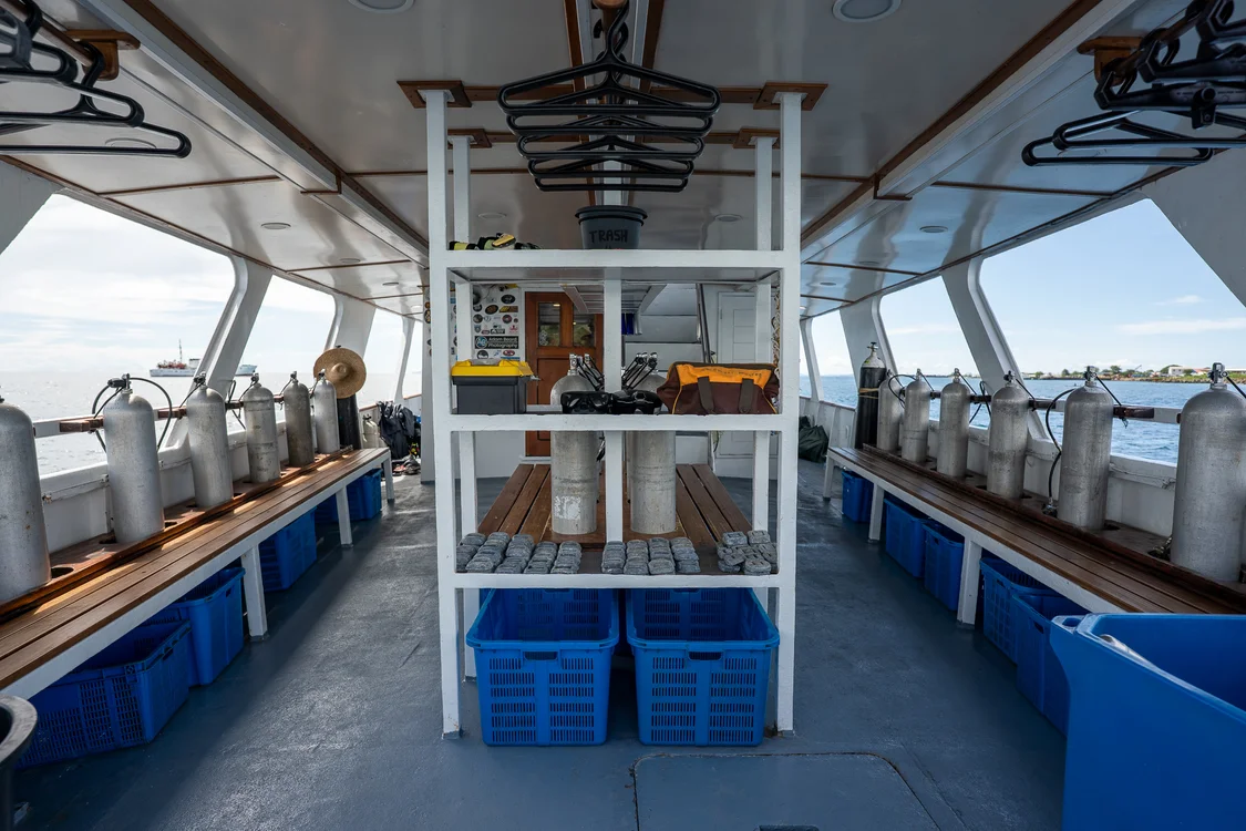 Przestronny pokład nurkowy został zaprojektowany z myślą o wygodzie i funkcjonalności – indywidualne stanowiska do przygotowania sprzętu, schowki pod ławkami oraz platforma rufowa z drabinkami zapewniają sprawną organizację nurkowań. Jednostka jest w pełni przystosowana do obsługi nurków rekreacyjnych, technicznych oraz rebreatherowych.
