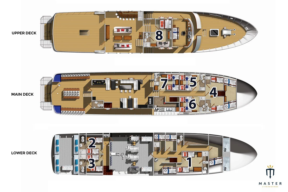 Solomons Master to stalowy jacht oferujący komfortowe warunki dla maksymalnie 16 gości. Na pokładzie znajduje się osiem dwuosobowych kabin w standardzie classic, premium lub superior. Każda kabina posiada prywatną łazienkę oraz indywidualnie sterowaną klimatyzację.